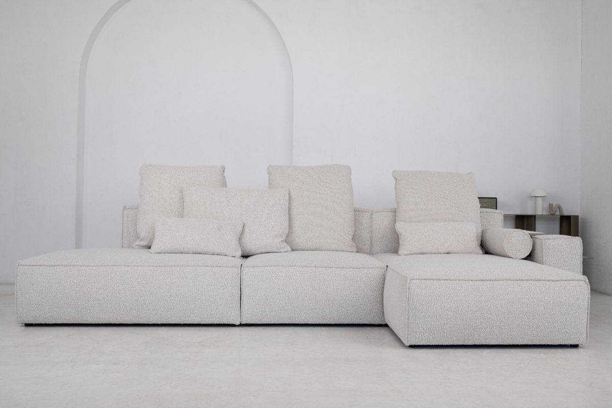 LOOMA to nowoczesna sofa modułowa, która łączy minimalistyczny design z maksymalnym komfortem użytkowania. Wykonana z wyjątkowo miękkiej i stylowej tkaniny bouclé, idealnie wpisuje się w aktualne trendy wnętrzarskie. To doskonały wybór dla osób szukających eleganckiego i funkcjonalnego rozwiązania do salonu.